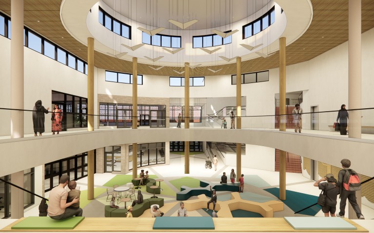 Elements such as geometric patterns, natural light, landscaped gardens, and culturally inspired details create an environment that feels both inspiring and familiar, one that reinforces a sense of belonging and pride.
